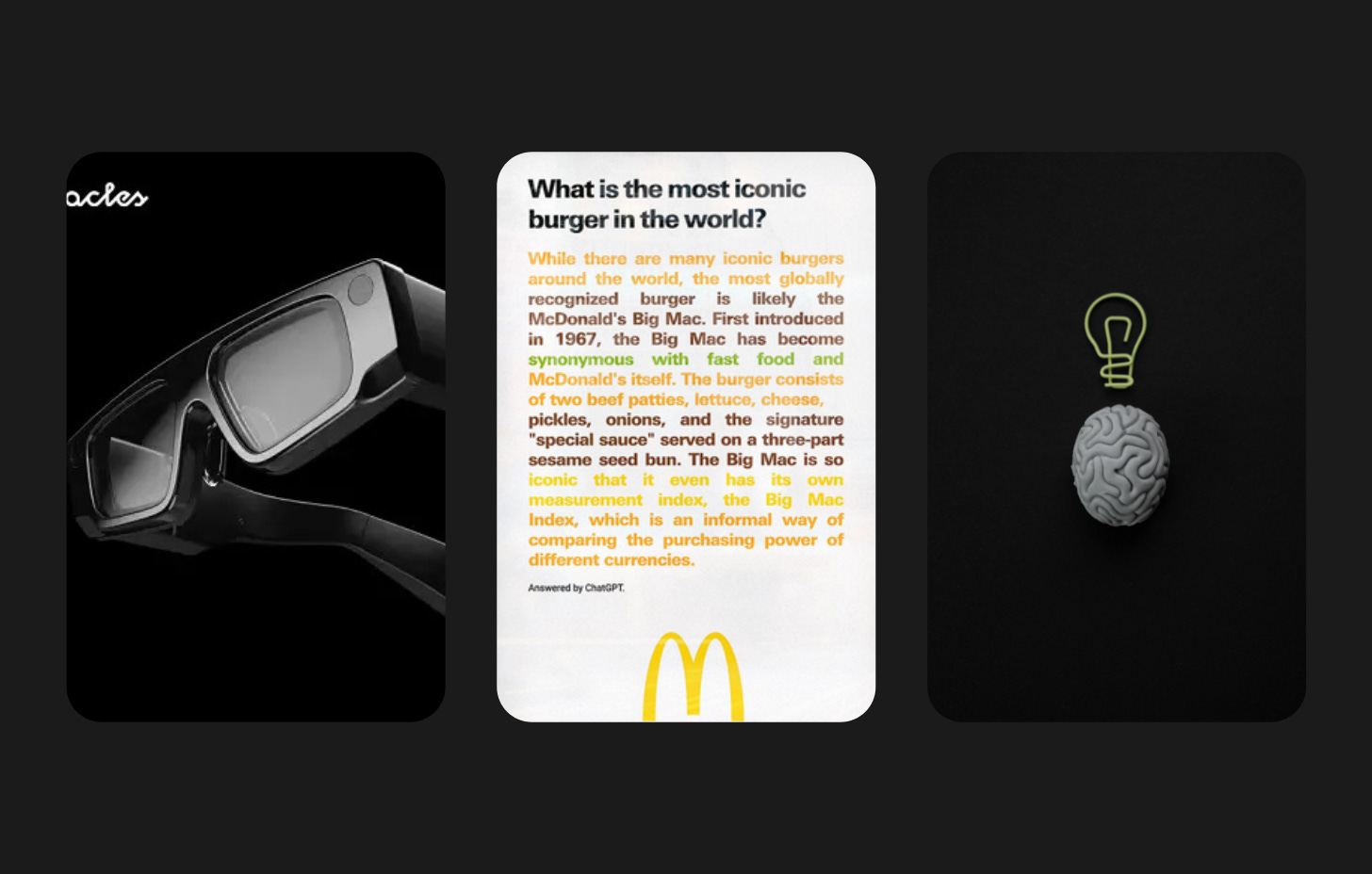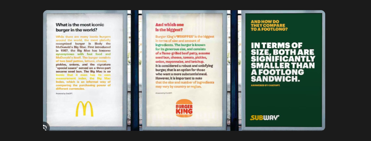 Totuși, mi se pare o idee foarte inovativă și faină de a folosi AI-ul în avantajul tău. Îmi place cum McDonalds a colorat și textul în funcție de layerele din Big Mac, dar e foarte mișto și răspunsul Burger King și Subway.